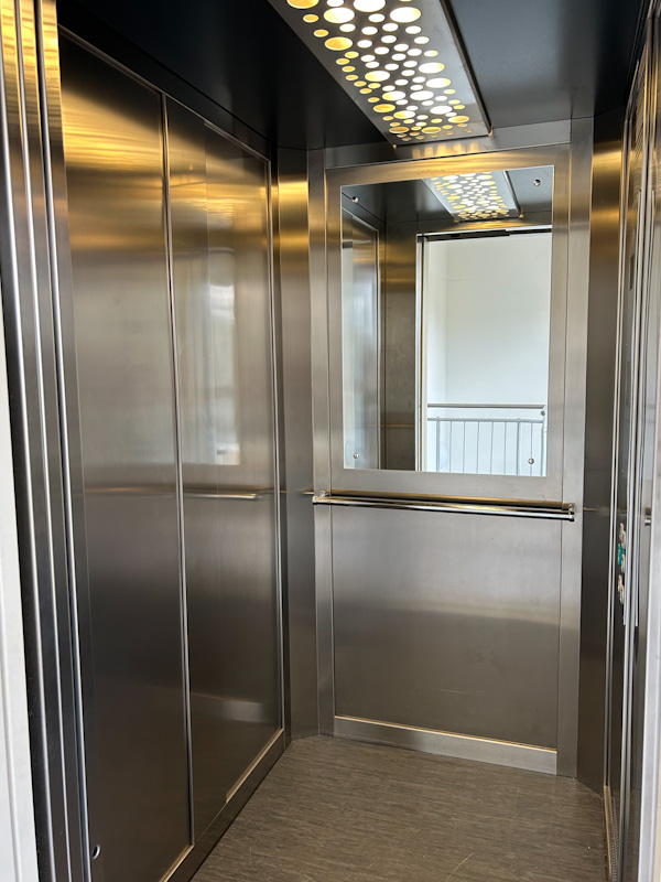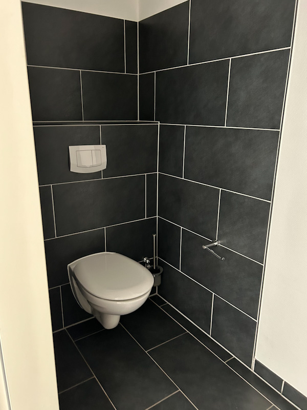 Die komplette Einheit ist durchgängig mit hellem, hochwertigem PVC-Bodenbelag und zum Teil mit Glasinnentüren versehen. Die beiden Toilettenräume sind mit großen, anthrazit Fliesen ausgelegt.